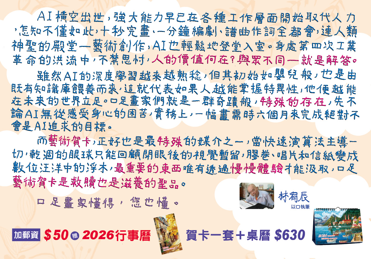 謝謝您的到訪,希望透過我們的網頁,能充分讓您感受到畫家們是如何從過去重生,在當下奮鬥,並且藉由口足藝術商品和您攜手營造更美好的未來生活。